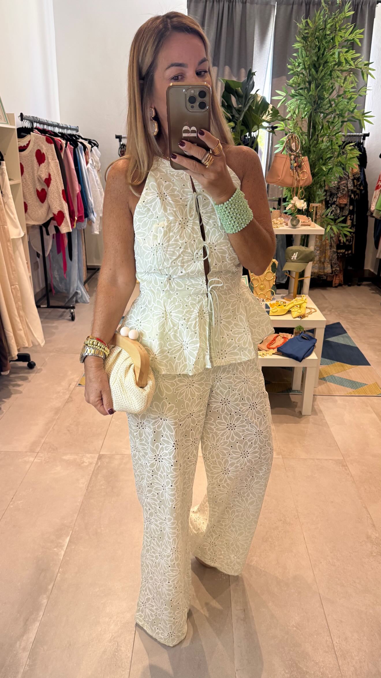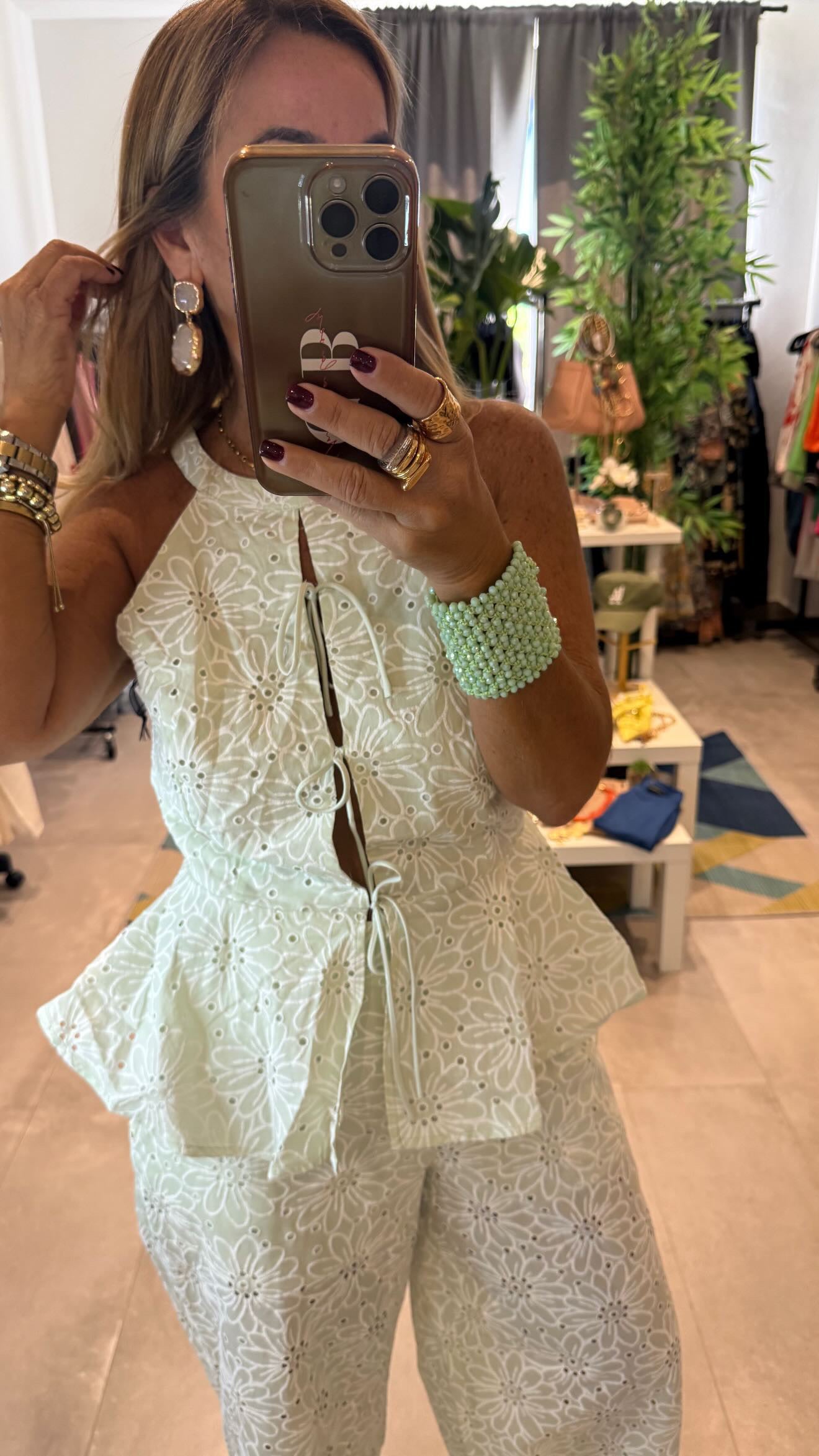 Espectacular set perfecto a talla No tiene strech la parte de arriba es ajustable